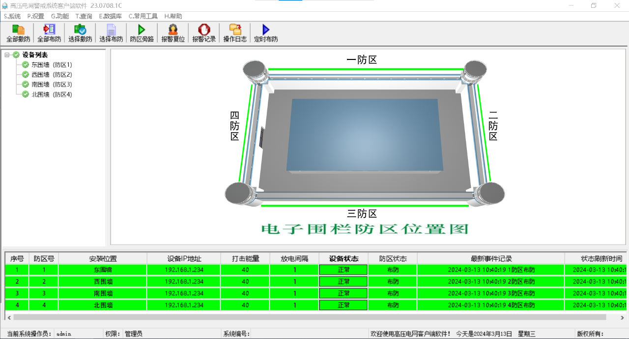 ● 功能:管理控制前端高壓電網主機、分控主機;實時監控前端電網圍欄防區狀态以及對防區參(cān)數設定;支持報(bào)警信息、軟件操作信息查詢導出